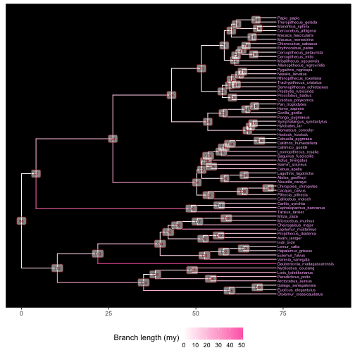 In this tutorial, I build some fancy primate phylogeny plots that demonstrate the features of ggtree I have found most useful for displaying comparative data and the results of ancestral state reconstructions (ASRs). Although I don’t cover the full breadth of the ggtree vignette, I do go a bit beyond the vignette in a couple of places (e.g., providing a function to annotate multiple nodes with different external images). A thorough overview of ggtree capabilities can be found in the package vignette, and tutorials written by the package author here and here.